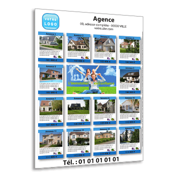 Développez vos ventes avec ce Flyer Immobilier "Petites Annonces". Imprimé sur un papier de haut de gamme écologique, ce flyer A4 recto vous permettra de promouvoir 14 biens présentés chacun par le biais d'une photo, d'un texte et de leurs dépenses énergétiques.